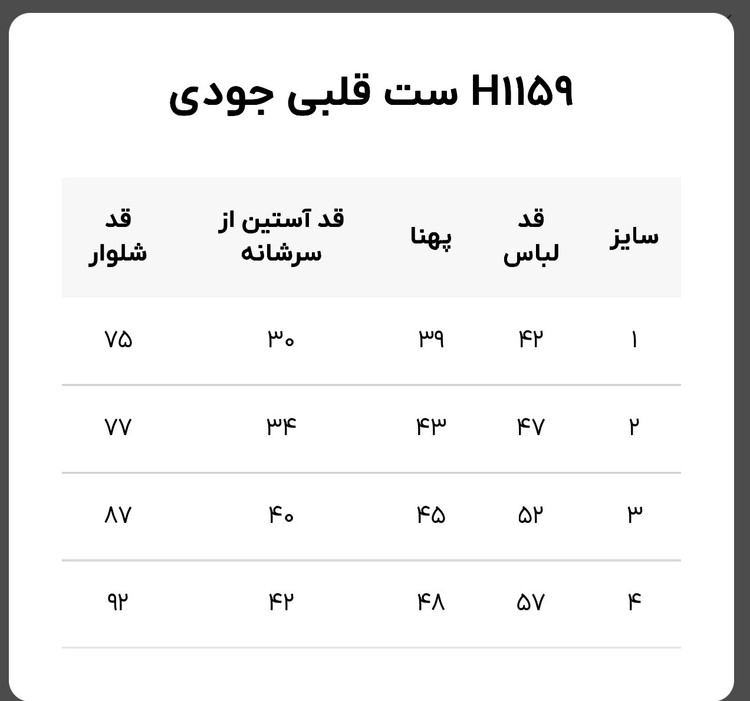 قد لباس 57 پهنا 48 آستن از سرشانه 42 قد شلوار 92