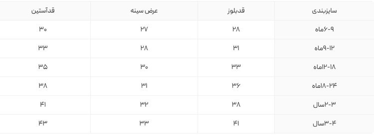 سایزبندی از ۶ ماه الی ۴ سال